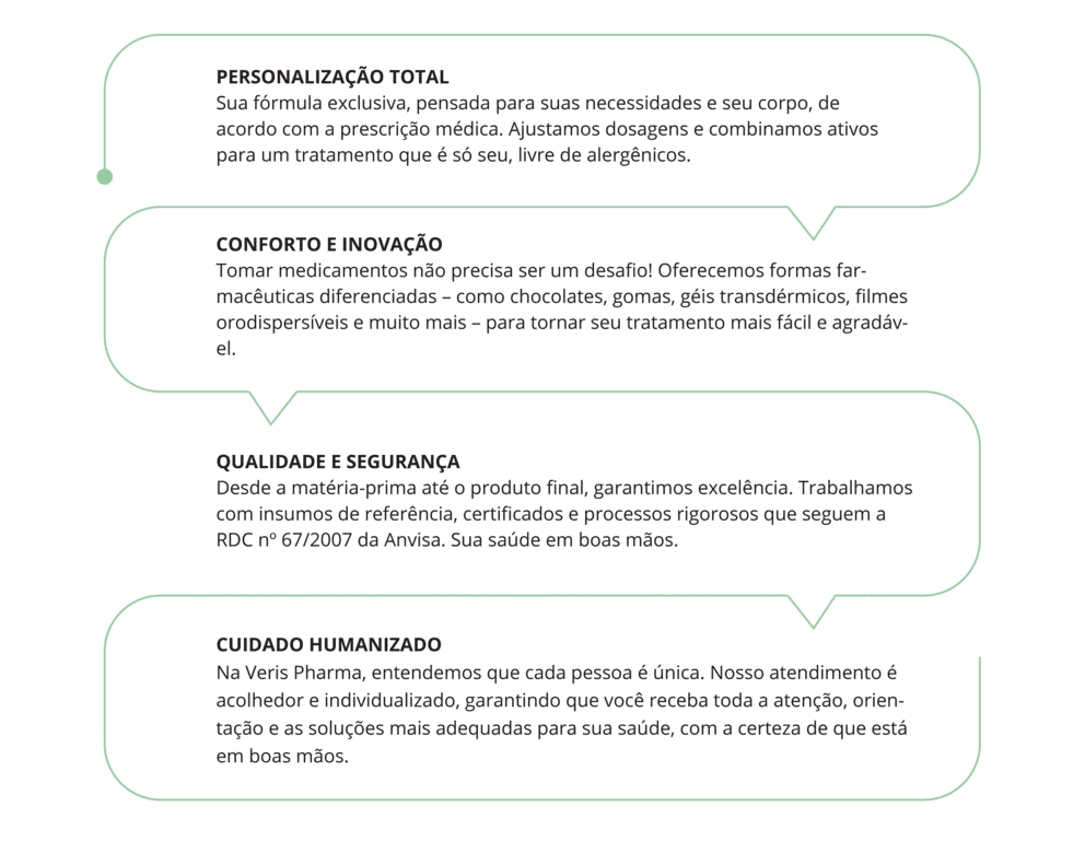 A Veris Pharma nasceu da convicção de que cada pessoa merece um tratamento farmacêutico adaptado à sua individualidade. Oferecemos medicamentos manipulados com qualidade garantida, formas inovadoras e atendimento verdadeiramente humanizado.